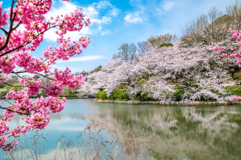 日本の「さくら名所100選」に選ばれている公園で、2月中旬に開花する寒桜を皮切りに、78品種1,600本のさくらが咲き乱れます。