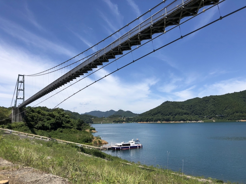 湖の上には315mもの長さの歩行者専用大吊橋が架けられており、渡りながら広大な芝生や水辺のある園地や、山と宮ヶ瀬湖の雄大な景色を眺めることができます。