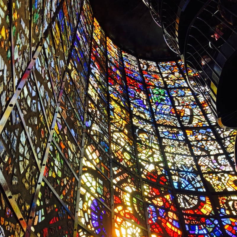 彫刻の森美術館を象徴する塔「幸せを呼ぶシンフォニー彫刻」は、高さ18メートル、内径8メートルの塔です。全面にステンドグラスがはめ込まれた空間は、外からの光をうけて幻想的な世界を見せてくれます。