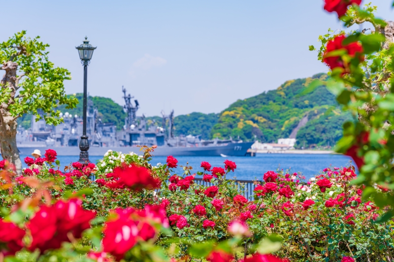バラの見頃は例年、春は5月~7月初旬、秋は10月~11月下旬ごろ。園内にはカフェもあり、コース料理やガレット、さらには横須賀ネイビーバーガーも味わえます。