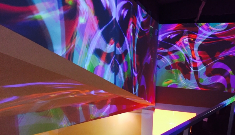 プロジェクションマッピングとは違う、空間そのものを楽しむための「デジタル掛け軸」。刻々と変化する色彩豊かな幾何学模様に包まれながら、非日常の世界を堪能できます。