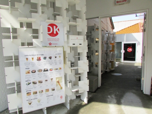 DKアートカフェは、企画から建築、運営を含め全て金沢工業大学の学生たちの手によって創られています。石川県小松市在住のデジタルアーティスト長谷川章さんと金沢工業大学の有志たちとが出会い、世界で初めて、常設で店内空間へデジタル掛け軸を投影するカフェが誕生しました。