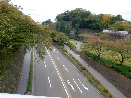 石川門手前には石川橋という名の橋がかかっていますが、ちょっと橋から下を覗いて兼六園と金沢城の間を走る道路に注目!