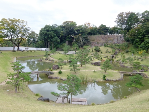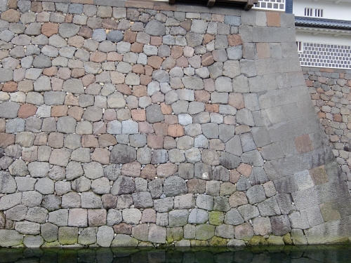 城の内庭であった玉泉院丸庭園に面したこちらの石垣は、高さや向きや色を変え、防御というよりむしろデザイン性が高いと感じる石垣。庭の景観の一要素として機能していたと考えられています。