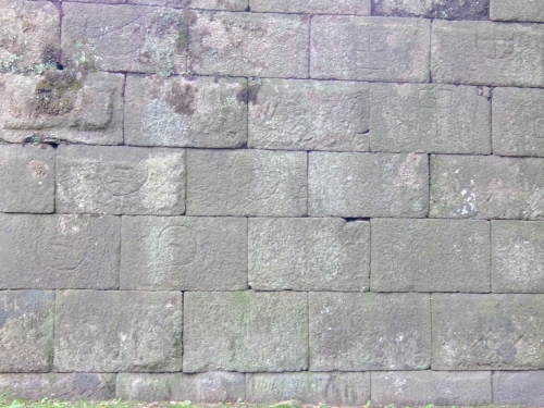 きっちりとパズルのようにはめ込まれた数寄屋敷石垣。近づいて見てみると、石に何やら模様が刻まれているのが見えます。