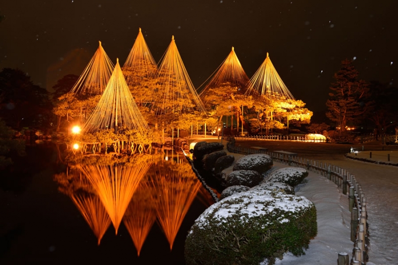 シンシンと降る雪のなか、あたたかい光が照らし出す冬の兼六園も素敵です。