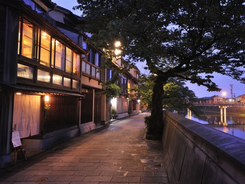 金沢にある三つの茶屋街のひとつで、最も知られるのが一番最初に紹介した『ひがし茶屋街』。この『主計町茶屋街』は浅野川沿いにあるのが特徴的で、川沿いの木々と街灯もあいまって風情のある景観を楽しめます。