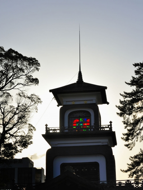 和漢洋の三様式が用いられた珍しい門で、第一層には戸室石、そして最上階の三層目には美しいステンドグラスが飾られています。
