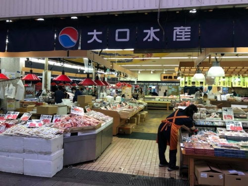 近江町市場内・上近江町通りにある鮮魚店「大口水産」では能登ふぐをはじめ、エビ串やイカゲソなどを販売。提供前に炙り直してもらえるので、焼き立てを味わえます。