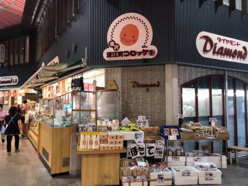 近江町市場内での名物が、世界の食品ダイヤモンド近江町市場店の「近江町コロッケ」。一日で1,000個も売れるというコロッケは、観光客はもちろん、地元のお母さんたちが大量買いをしていく姿をみかけます。おやつにもおかずにも変幻自在のコロッケは、いつの時代もお母さんたちの味方!?
