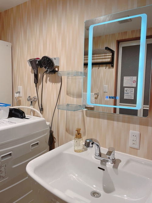 洗面所には、洗面台や洗濯機(乾燥機能付き)があり、洗濯洗剤も完備されています。洗面台のミラーには、気温や時間なども表示されるハイテクぶり!!また、設備品には、ドライヤー(ダイソン)の他、ヘアアイロン(SALONIA)などあります。