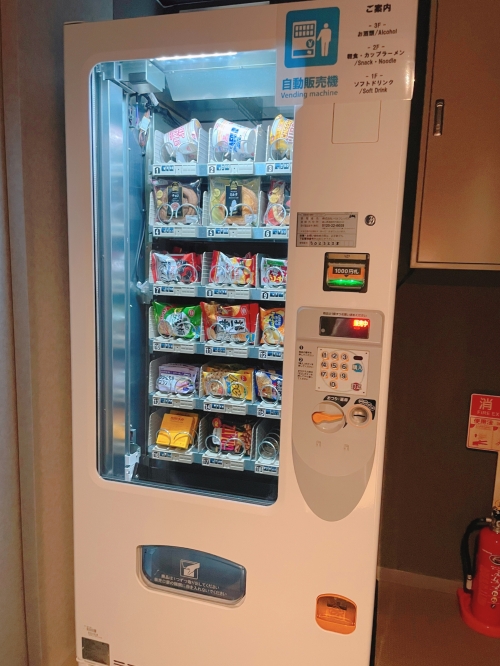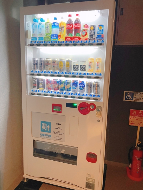 徒歩約2分の場所にコンビニもありますが、外に出なくても施設内には、自販機があり、ソフトドリンクをはじめ、アルコール類やおつまみ、カップラーメンや菓子パンまで購入することができます。自販機なので夜中でも気軽に利用できるのもいいですよね?!