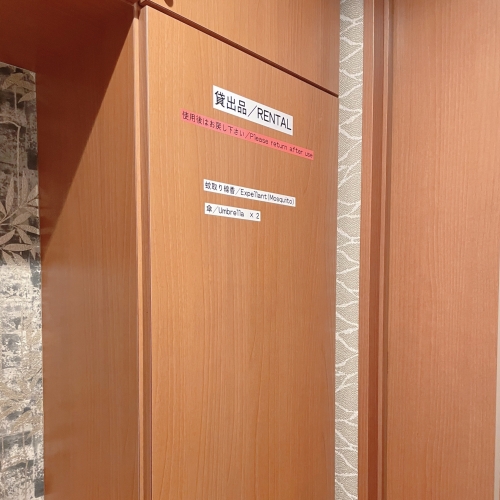 部屋に入るとまず玄関があるので、靴を脱いで過ごすことができます。コンパクトではありますが、玄関と室内は扉で仕切られているのもポイント。靴箱の上には手指消毒剤やウェルカムギフトが置かれています。また、隣の収納には貸し出しの傘や虫よけなど備わっています。