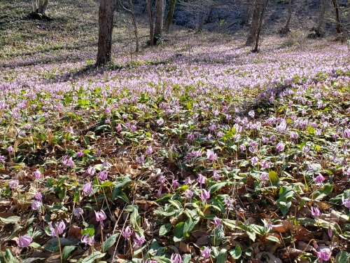 可児市の主峰「鳩吹山」の麓に流れる木曽川の横には、約10万株と言われるカタクリの群生地が広がっています。毎年3月下旬頃から4月上旬にかけて紫色の花を咲かせ、多くの人々を楽しませます。