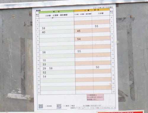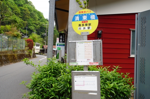登山道出口から、一般道を15分ほど歩くと、西東京バス「清東橋(せいとうばし)」バス停があります。ここからバスに乗車し、最寄り駅へ向かいます。この清東橋のバス停は「日本一観光トイレがきれいなまち」と町の取り組みを紹介するポスターが貼られ、なんとトイレの中には盆栽が飾られていました。トイレがキレイってうれしいですよねー。