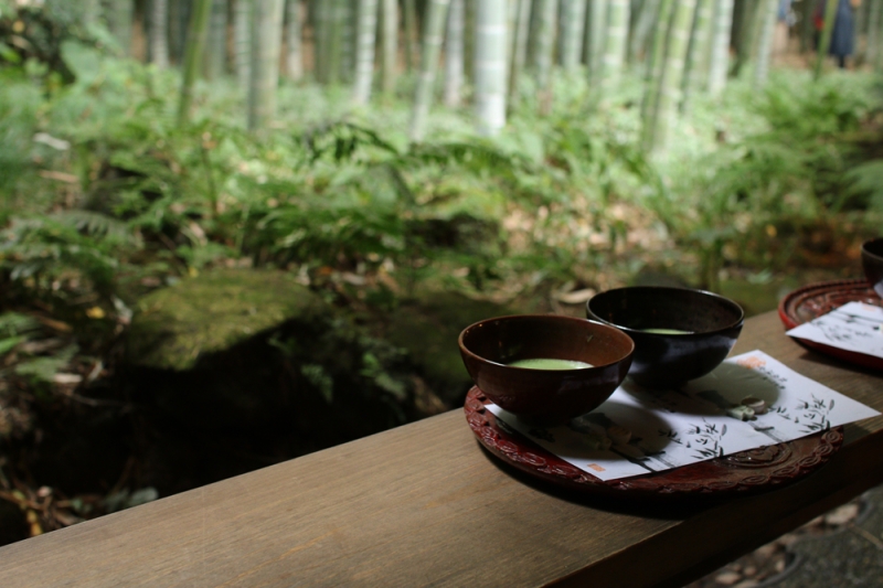 「竹寺」として親しまれている報国寺。境内の竹庭には高さ約25mの竹が1,000本ほど群生し、日本らしい風情のある景観が楽しめます。この竹庭に設けられた喫茶スペースが、「休耕庵」。美しい竹林を眺めながらいただくお抹茶は格別です。