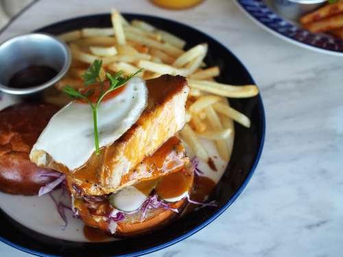 バーガーカフェだけあって、メニューのメインはハンバーガー。そのほかには、パスタやカレー、パンケーキやデザートもそろっています。お店のイチオシは、「ブルーターミナルバーガー」。目玉焼きと分厚いポークベリーが2枚も入っている贅沢な一品です。