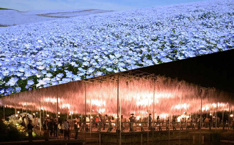 一方、もう一つの花名所「あしかがフラワーパーク」では、ネモフィラの開花時期とちょうど同じ時期に藤の花の夜間ライトアップが開催されています。