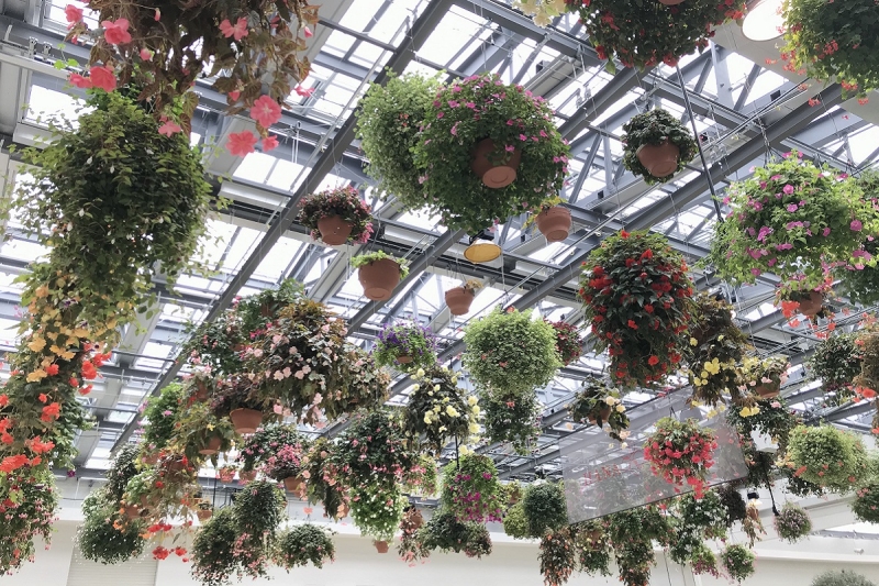 屋内外に沢山の花が咲いていますが、その中でも温室の「HANA・BIYORI館」では、壁面に長さ20m、高さ2mを超える壁面花壇があり、360度にわたって花を楽しめます。また、日本最大級となる300鉢を超えるフラワーシャンデリアが天井を彩っています。