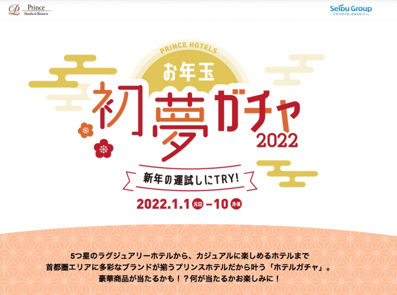西武グループであるプリンスホテルでは、「お年玉初夢ガチャ2022」というホテルガチャキャンペーンが、2022年1月1日(土)より販売されます。価格は、1回10,000円です。