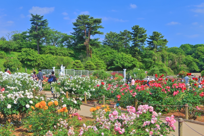 1958年(昭和33年)にオープンしたバラ苑は、約1.2haの敷地に、春には約805種3,300株、秋には約625種2,900株のバラが咲き誇る、日本最大規模のバラ園です。バラの見頃を迎える春と秋の年2回のみ開園します。