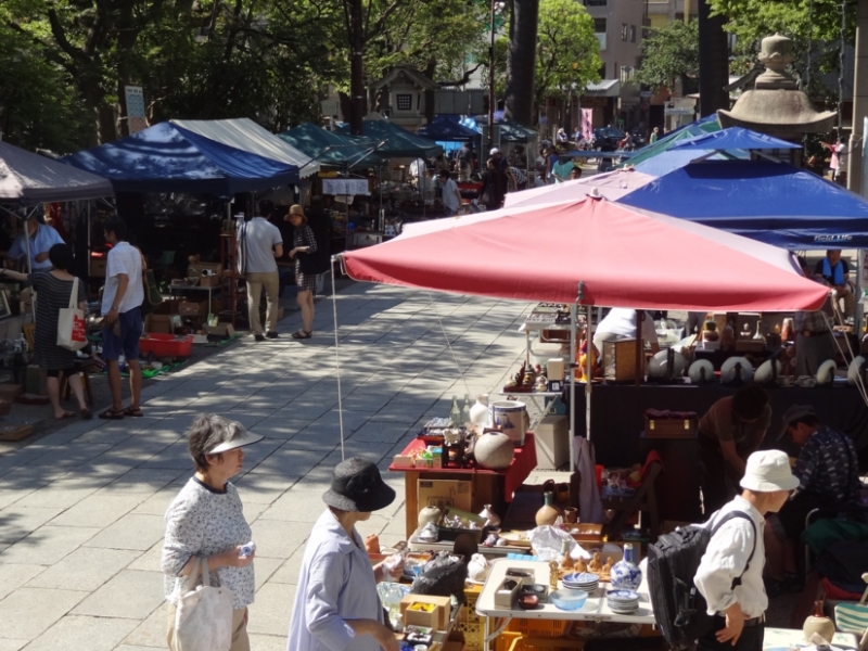 ご縁日の28日に開催される成田山開運不動市にには50店ほどが軒をつらね、古民具や陶磁器、古書、古布などのアンティークな品々や、ガラス製品などがたくさん並びます。これを目当てに、ご縁日にお参りされる方も多いのだそう。