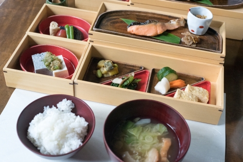 「星のや 軽井沢」内にある日本料理 嘉助。夕食は予約が必要ですが、朝食は予約なしで食べることが出来ます(朝食膳:3,520円)。棚田テラスを眺めながらの朝食は清々しいので、滞在中一度は利用してもらいたい場所です。