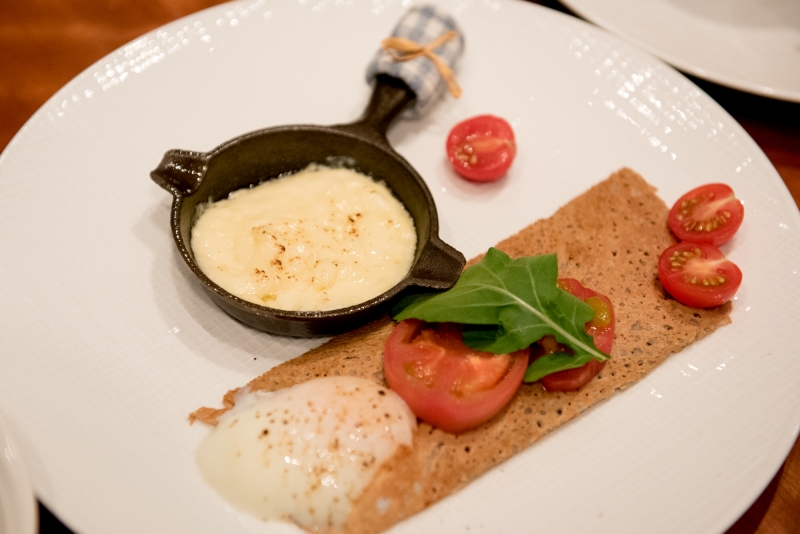 メインであるそば粉のクレープはテーブルに運んでくれます。スキレットに入っているアツアツのチーズをかけて食べるクレープは絶品です!