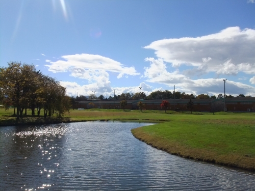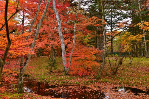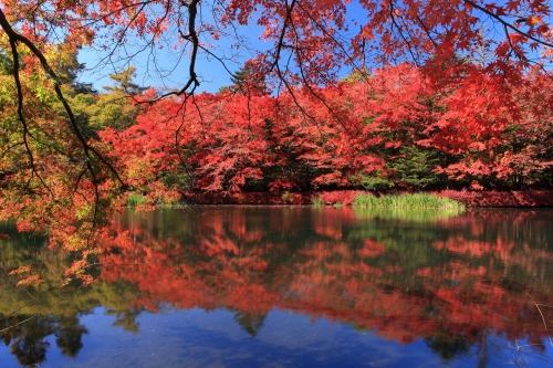 澄みきった空の青に芝生の緑、紅葉の燃えるような赤。見事なまでの美しいコントラストを、湖面が鏡のように映し込む。そんな絵画のような風景を見ることができます。