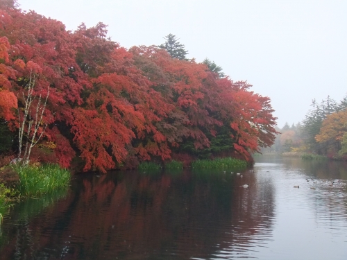 雲場池は長細い形をしているため、対岸までの距離が近く、大パノラマで紅葉が楽しめるのが魅力です。