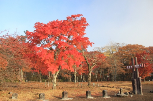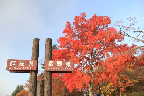見晴台は長野県と群馬県の県境に位置しており、その境界には県境を示す木製のプレートが立っています。なかなか出会えない環境ですから、思い出に残る楽しい写真を撮りましょう!背後の大きなもみじが写真に華を添えてくれます♪
