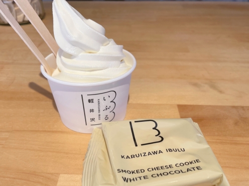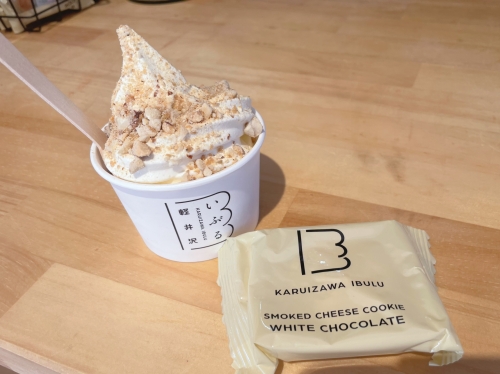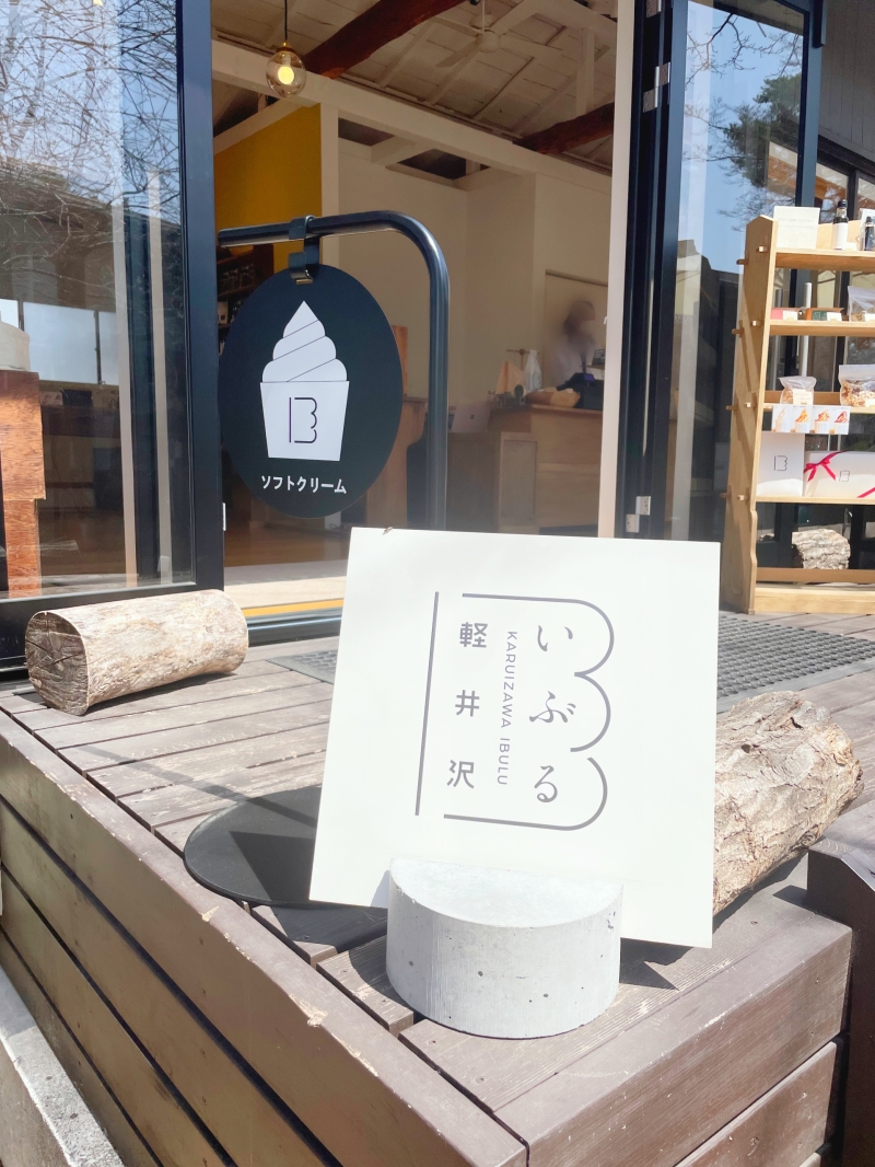 OSOBARの真横にある「軽井沢 いぶる」は、燻製の商品を扱うお店です。おつまみから調味料まであり、お土産選びにも最適!!また、ソフトクリームの販売もあり、ひと休憩するにもいいですよ。店内にも外にもベンチがあり、腰かけていただくことができます。