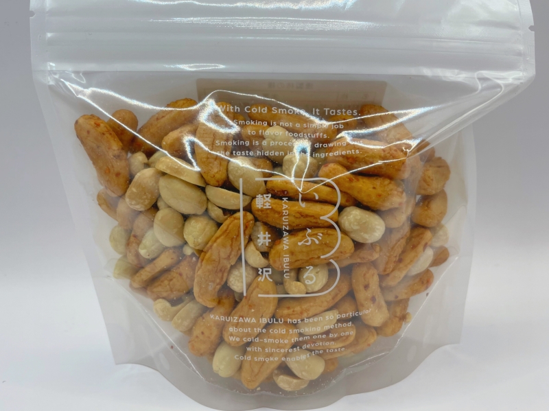 「燻製柿の種(1,290円)」は、ピリ辛でおつまみにもうってつけな品です。ちょっぴり大き目の柿の種とピーナッツが入っています。一袋あたり150gと見た目以上に量もしっかりあり、袋はジップ付きなので、食べたい分だけ取り出し、残りは保存することができますよ◎