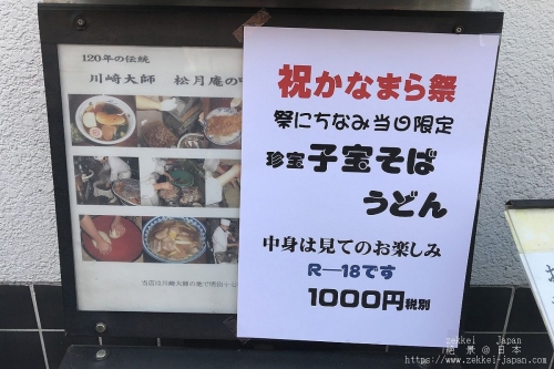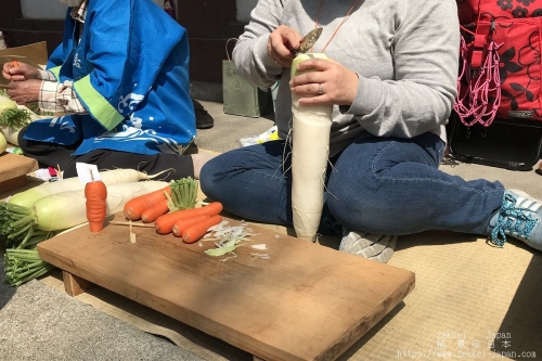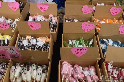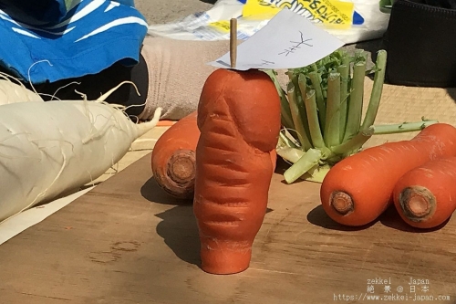 境内の一角ではニンジンや大根を男根形に削るという野菜細工の一種が行われます。(写真は2018年4月3日に撮影したものです。)