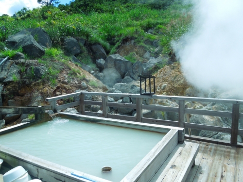 一軒宿の温泉。乳白色のお湯(単純硫黄泉)も人気の秘密ですが、露天風呂や箱蒸し風呂、打たせ湯など様々な入浴法が楽しめる点も魅力です。泥湯は美肌効果もあるので女性にオススメ。