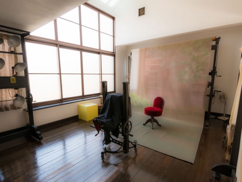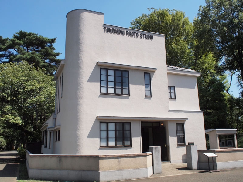 レトロモダンな外観の常盤台写真場は、戦前からの代表的な郊外住宅地である常盤台に、1937年(昭和12)に建てられました。2階の撮影場の大きな窓には光がはいるようすりガラスがはめこまれていますが、これはスラントといい、まだ照明設備が発達していなかった頃の写真感の特徴をあらわしています。