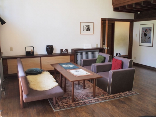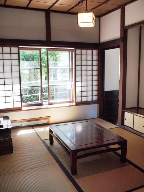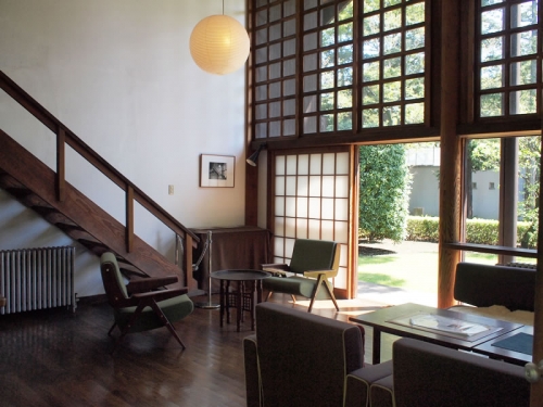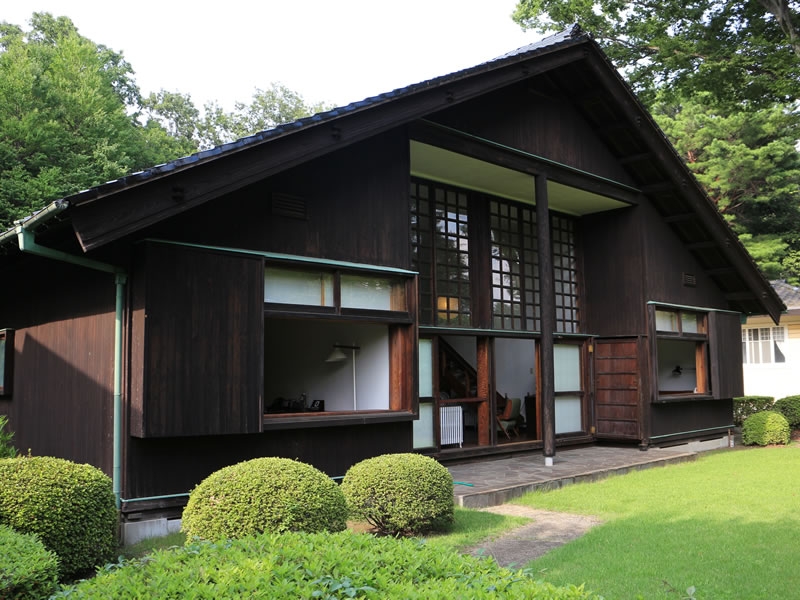 1942年(昭和17)、現在の品川区上大崎三丁目に建てられた前川國男の自邸です。前川國男は日本の近代建築の発展に大きく貢献した人物で、この自邸は切妻屋根の和風の外観に、邸宅内は吹き抜けの居間に書斎、寝室が配されたシンプルなつくり。前川國男邸は1973年(昭和48)に解体され部材として保管されていました。この復元では外観は1956年(昭和31)に改修される前の姿にもどし、内部は昭和30年代の様子を再現。