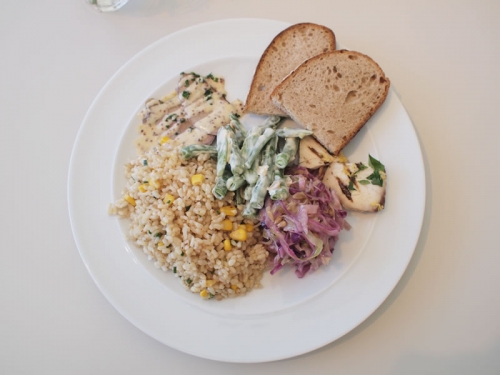 店内の大きなガラス張りの窓からはあたたかい日差しがたっぷりはいり、その窓からはのどかな小さな公園が見えて、ほのぼの。真っ白な店内でいただけるのはデリプレートのランチやキッシュ、サンドイッチなど。
