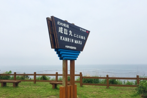 「サラキ岬」で津軽海峡と咸臨丸を眺める