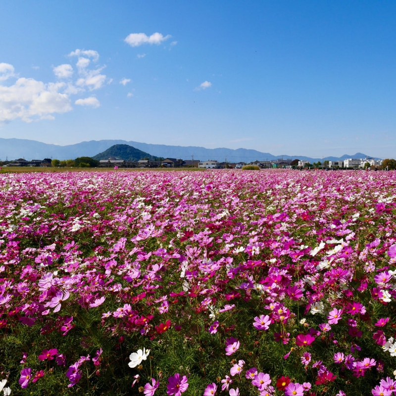 秋には約30,000㎡の敷地に約300万本のコスモスが咲き誇り、大和三山も望む景観とともに一面の花畑を楽しむことができます。