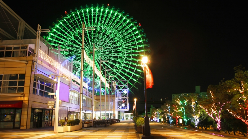 地上高112.5mを誇る、世界最大級の巨大観覧車「天保山大観覧車」。1周の所要時間は約15分で、キャビン内では景観案内放送と共に絶景を楽しむことができます。側面、底面、座席部分が透明なシースルーキャビンもあり、ゆったりとした観覧車といえども、まるで空中に浮かんでいるかのような大迫力を味わうこともできます。