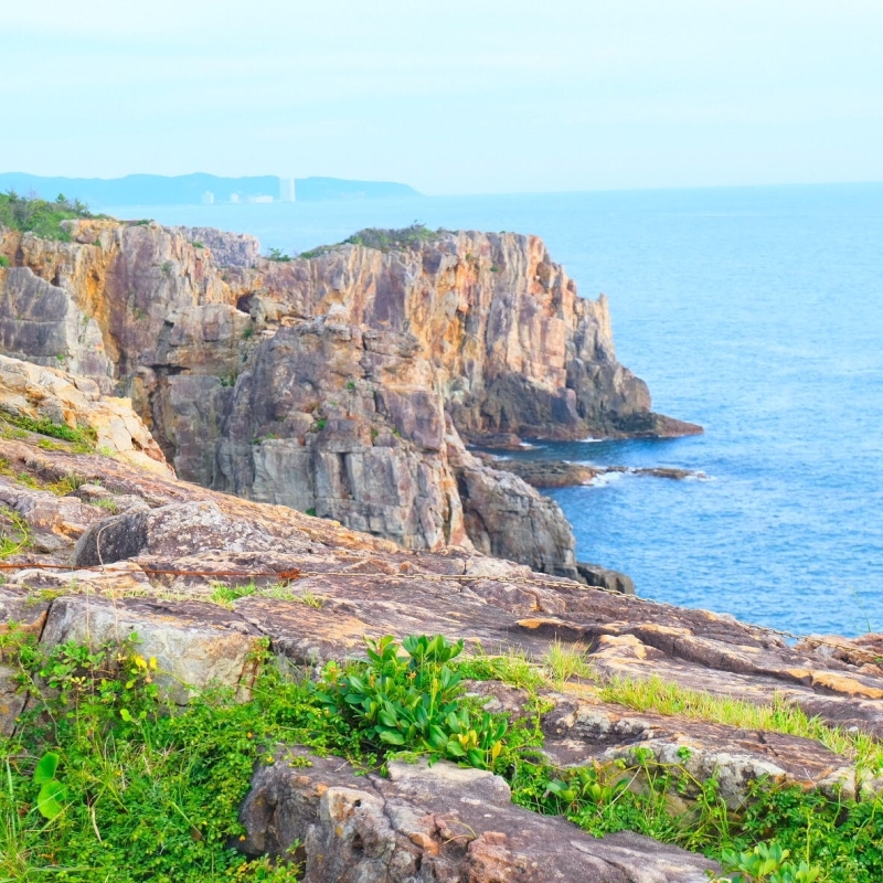 広さ約4haで、名前のとおり〝千枚の畳が敷けるくらい〟の広さが圧巻の千畳敷。「円月島(高嶋)及び千畳敷」の名称で、国の名勝にも指定されています。薄い大きな岩が何層にも重なっていて、岩の上を歩いて海近くまで行くことができ、ここから見える夕焼けは絶景!