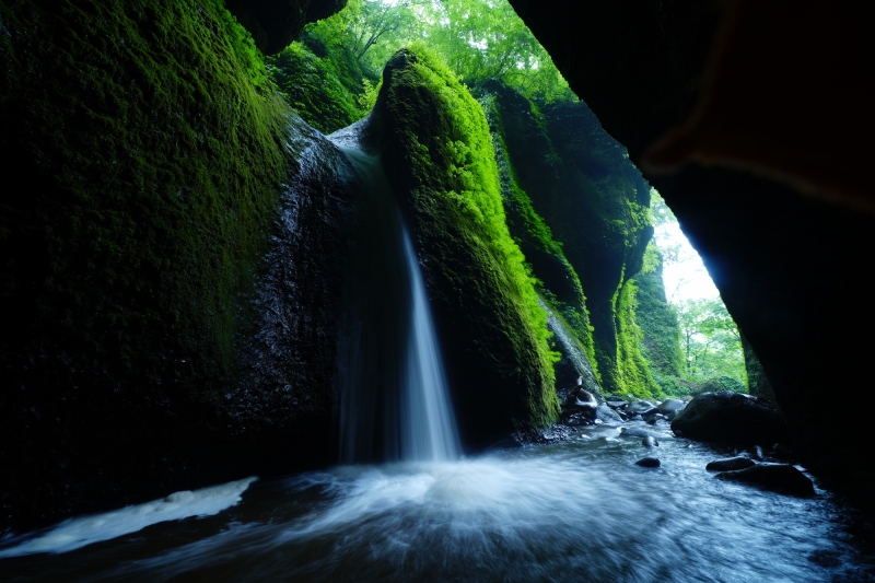 兵庫県と鳥取県の県境にもほど近い新温泉町にある、知る人ぞ知る名瀑。落差は約10mと小規模ですが、緑色に苔むした岩肌から洞窟内に滝が流れ落ちる様子がとても神秘的です。