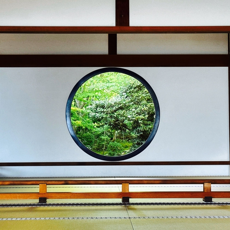 丸と四角の窓枠が額縁となり、窓の外に広がる庭をまるで日本画のように眺めることができます。雨に煙る庭園を、窓越しに静かに眺める時間はなんだか贅沢ですね。