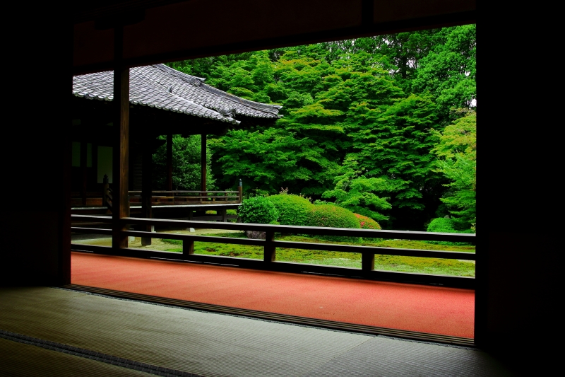 のどかな山里の大原にある宝泉院。盤桓園、鶴亀庭園、宝楽園の3つの庭園があり、一番の見所は盤桓園(ばんかんえん)。客殿から柱を額縁に見立てて眺めるため、額縁庭園とも呼ばれています。拝観料にはお抹茶と和菓子が含まれており、庭を眺めながらゆっくりお茶をいただくという大人なひとときが過ごせます。
