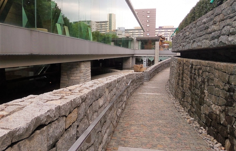 緩やかなスロープを下っていき、↑上の画像中央に見える分岐を左に進むとレストランの入り口が見えてきます。雨天の場合は、もちろん美術館内のエレベーターを利用することもできますよ。