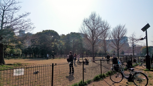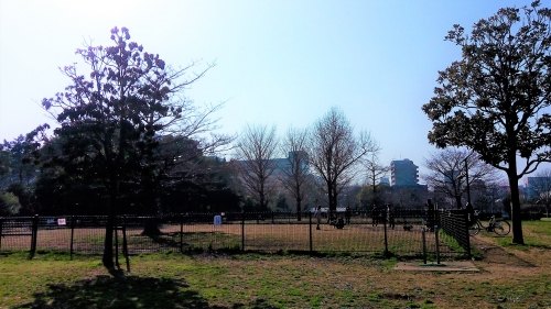ふれあい広場の南の端には、リードを外して犬を遊ばせることができる「ドッグラン」が併設されています。フェンスに囲まれたスペースの中を、さまざまな犬種のワンちゃんたちが走り回っています。愛犬家同士の交流も広く行われているようです。