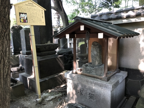 この猫塚は、文化13年(1816年)に実在した猫のために建てられました。墓石は長年うけた雨風の影響でだいぶ形が変わっていますが、現在ではガラス張りの小さなお堂の中に入り、大切に守られています。江戸庶民の生活や猫との暮らしの様子に思いを馳せながら、特に猫が好きな方にとっては、何かしんみりとした気持ちになって手を合わせたくなる場所です。