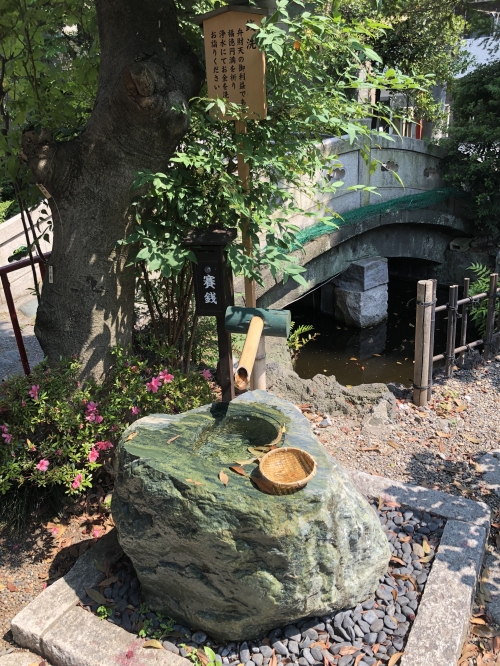 境内には銭洗弁財天もあり、銭洗や美玉洗もあります。弁天池にはアーチ型の小さな石橋がかかっていて、池に反射する日光や水の音が相まって素敵な雰囲気です。境内には他にも、墨田区内に37個あるといわれている力石の一つがあります。この力石は93貫(348.75kg)あり、一番重いものになります。力石は、江戸中期から末期に、力比べとして庶民に楽しまれたスポーツに使われていたそうです。