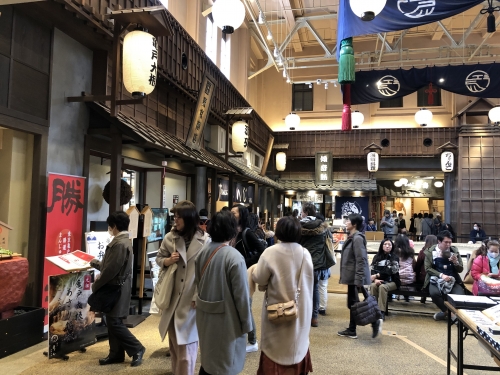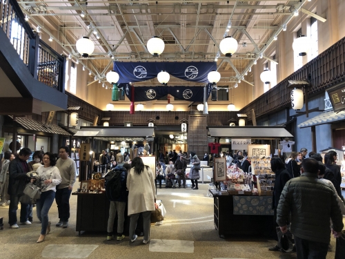 両国駅の旧駅舎に誕生した江戸NORENは、建物に入ってまず視界に飛び込んでくる原寸大の土俵、そして忠実に再現された江戸町屋がとても印象的な施設です。館内は、土俵を眺める人や、軒を連ねるお店でお土産を選ぶ人、食事を楽しむ人、フォトジェニックな館内の写真を撮る人などで賑わっています。